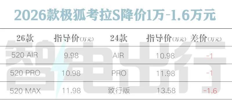 1月13日,极狐2026款考拉S正式上市,官方售价区间9.98万-11.98万元,比老款便宜1万-1.6万元。